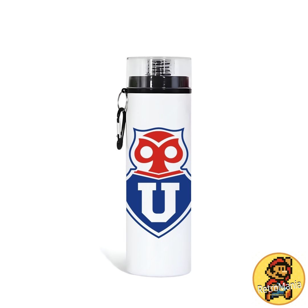 Botella de Agua Universidad de Chile, inspirada en el equipo de fútbol nacional que muestra sus colores característicos.